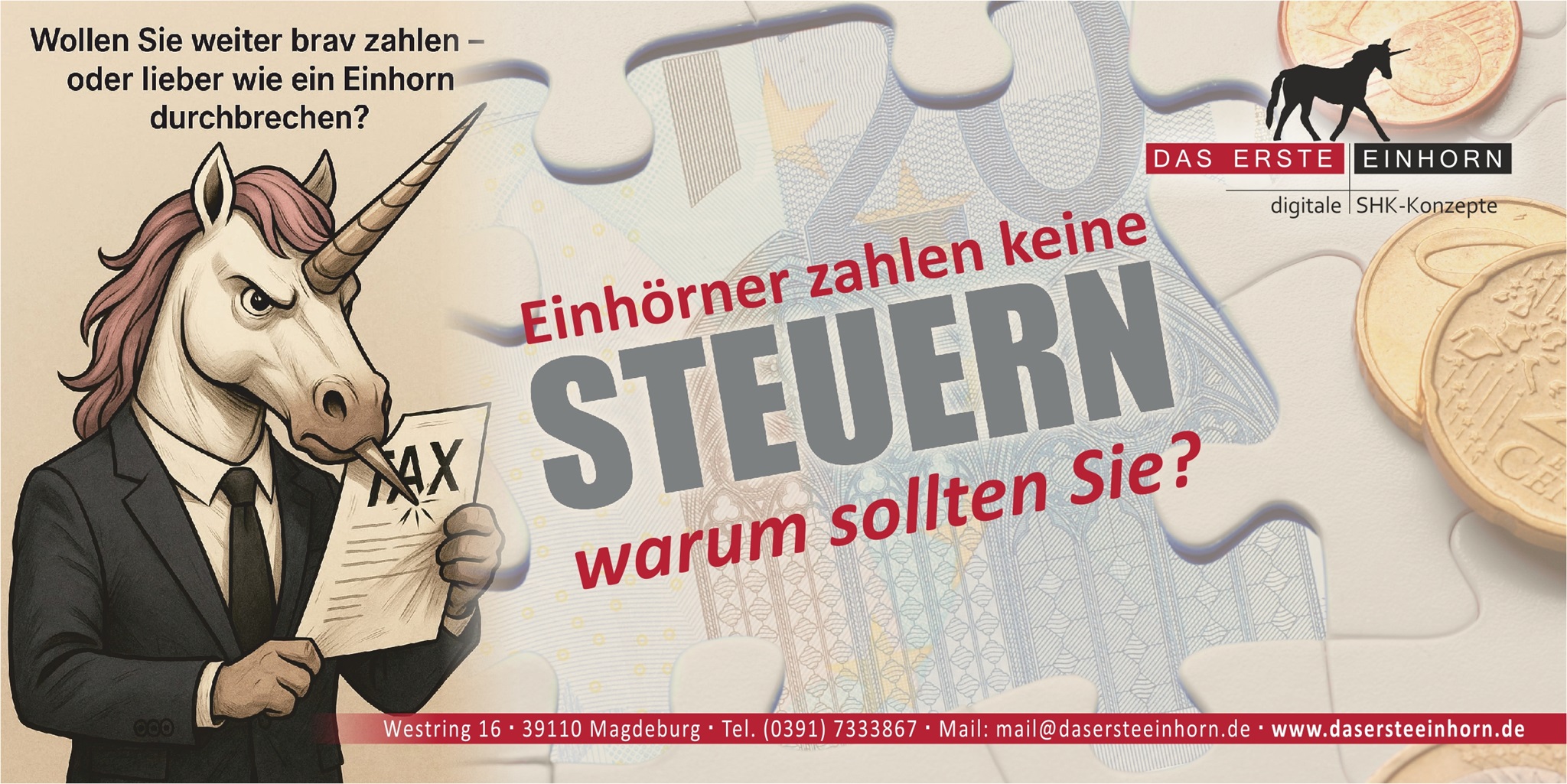 Profitieren Sie vom Einhorn-Prinzip: Unsere Firma heißt nicht zufällig The First Unicorn GmbH. Denn das Einhorn steht für Seltenheit, Mut und Durchschlagskraft – genau das, was Sie im Steuerdschungel brauchen.